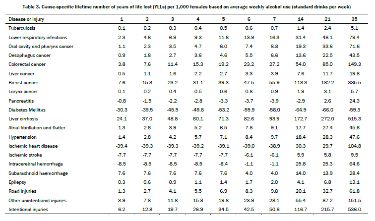 One way to interpret this (and it has limitations I’ll discuss in a minute) is to divide the number in the table by 1000 to indicate an average of how many years an individual might lose. So taking the highest number in this table, we would say women who drink 35 drinks per week have a risk of losing 536/1000 years of life (due to intentional injuries, so I guess this is self harm). So 0.536 years=196 days (rounded up).